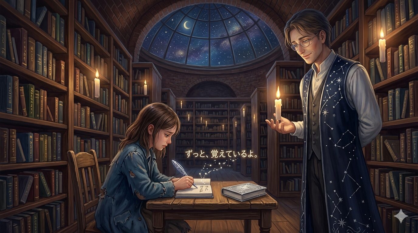 文字は、書いたそばから星の光になって、ページの上に小さく瞬いた。やがてその光は、紙の星座のように、ページの隅で静かに並び、やわらかく輝き続けた。