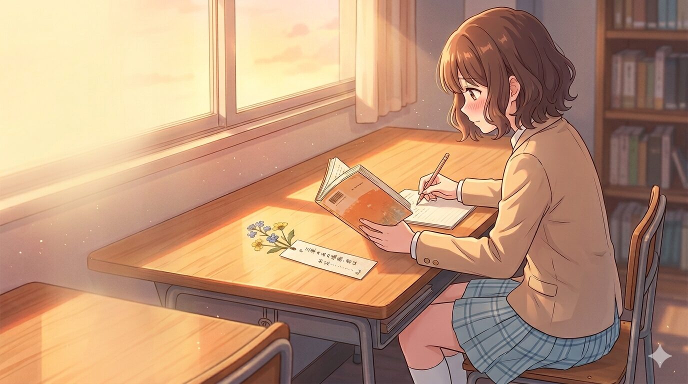 窓から差し込む西日が、机の木目をオレンジ色に染めていた。私はいつもの席に座って、借りたばかりの本を開く。隣の席には、誰もいない。でも、机の上に一冊の文庫本が置き忘れられていた。